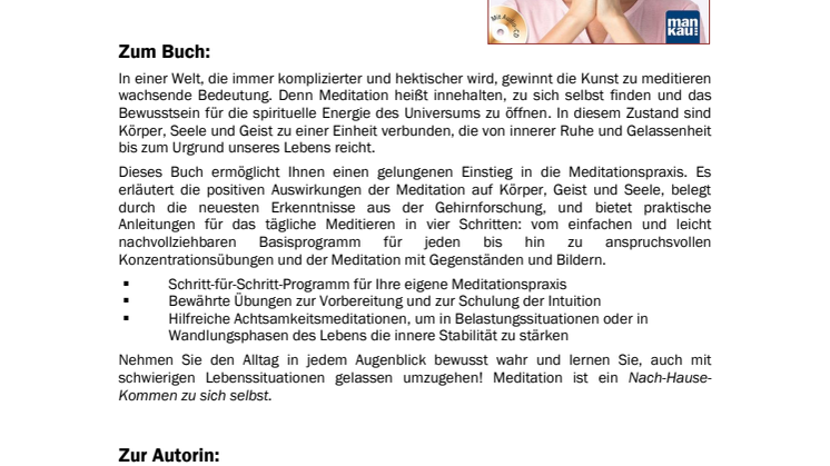 Es ist das Anliegen der Autorin, für die Meditation zu begeistern, weil diese so viel mehr ist als nur das Sitzen in einer bestimmten Haltung auf dem Kissen oder Bänkchen und das Sich-Versenken nach entsprechenden Regeln. Meditation führt zu innerer und äußerer Stabilität und gleichzeitig zu mehr Klarheit und zu einem Bewusstsein von Freiheit. Zur Vertiefung der Inhalte des Buches finden sich auf der beiliegenden Audio-CD ausgewählte Meditationen, die sowohl für Anfänger geeignet sind, aber auch als Anregung für die eigene Meditationspraxis oder die Arbeit z. B. in Yoga-Gruppen dienen können.