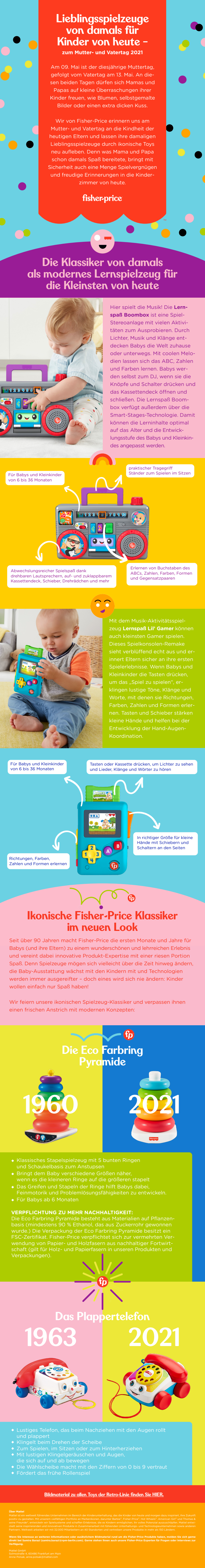 Wir von Fisher-Price erinnern uns am Mutter- und Vatertag an die Kindheit der heutigen Eltern und lassen ihre damaligen Lieblingsspielzeuge durch ikonische Toys neu aufleben. Denn was Mama und Papa schon damals Spaß bereitete, bringt mit Sicherheit auch eine Menge Spielvergnügen und freudige Erinnerungen in die Kinderzimmer von heute.