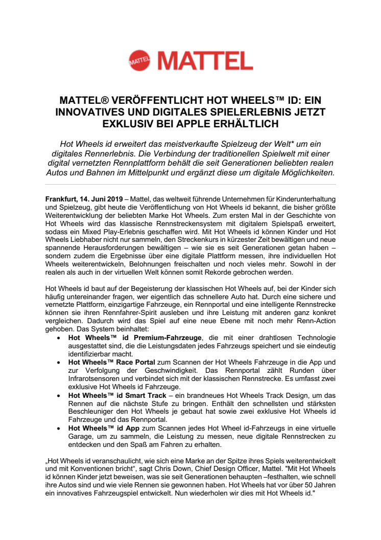 • Mattel® veröffentlicht HOT WHEELS™ ID: Ein innovatives und digitales Spielerlebnis jetzt exklusiv bei Apple erhältlich
