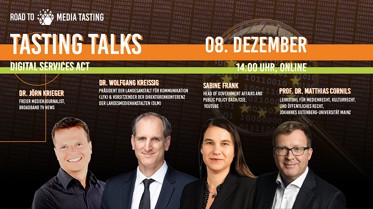 Wir sprechen zu diesen und weiteren Fragen im 34. Tasting Talk gemeinsam mit Sabine Frank, (YouTube/Google), Dr. Wolfgang Kreißig (LFK) und Prof. Dr. Matthias Cornils (Universität Mainz). Der freie Medienjournalist Dr. Jörn Krieger moderiert den Talk und führt durch die Diskussion.
