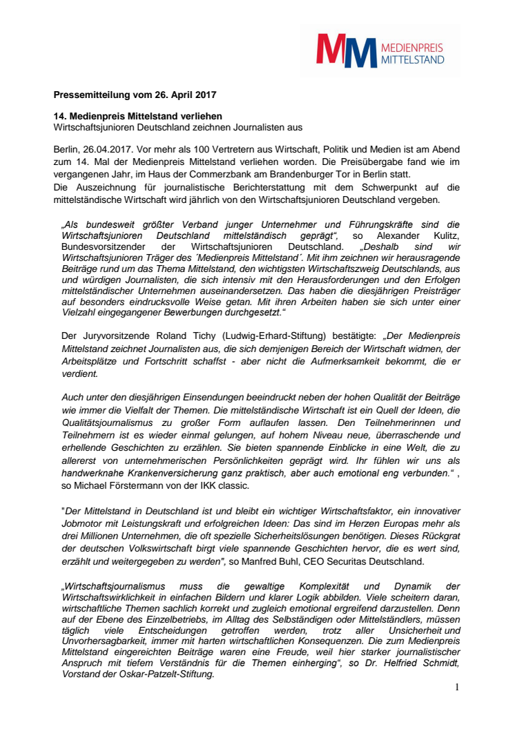 Berlin, 26.04.2017. Vor mehr als 100 Vertretern aus Wirtschaft, Politik und Medien ist am Abend zum 14. Mal der Medienpreis Mittelstand verliehen worden.