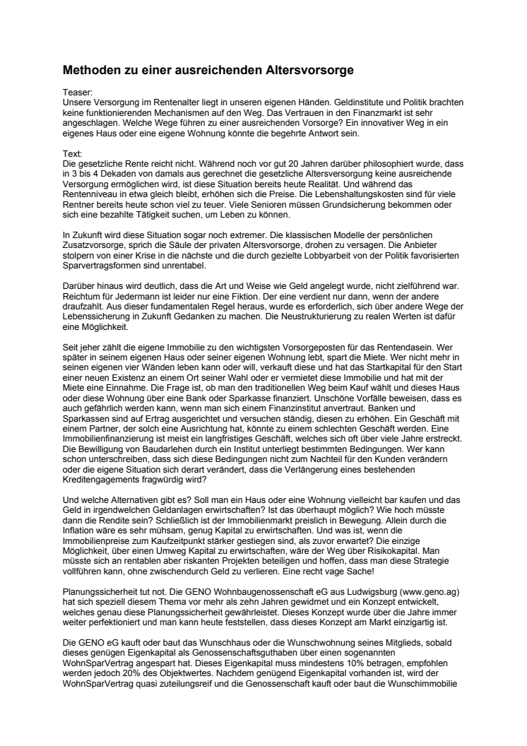 Unsere Versorgung im Rentenalter liegt in unseren eigenen Händen. Geldinstitute und Politik brachten keine funktionierenden Mechanismen auf den Weg. Das Vertrauen in den Finanzmarkt ist sehr angeschlagen. Welche Wege führen zu einer ausreichenden Vorsorge? Ein innovativer Weg in ein eigenes Haus oder eine eigene Wohnung könnte die begehrte Antwort sein.