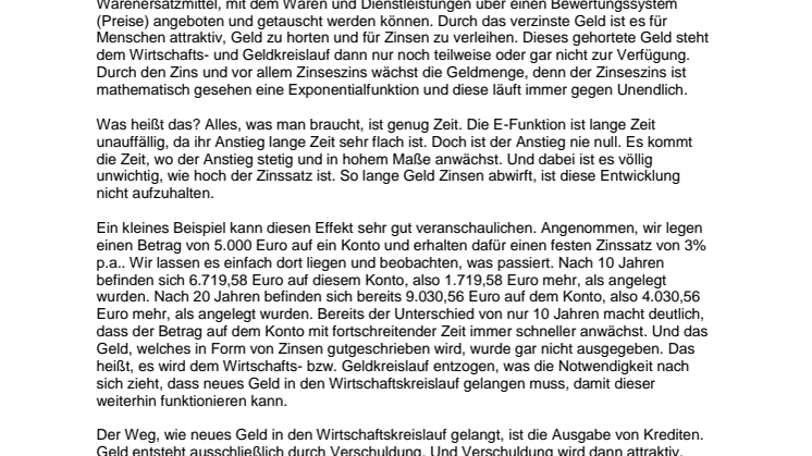 Machen wir einen Schritt zurück. Wie jedermann bekannt sein dürfte, ist Geld ein Warenersatzmittel, mit dem Waren und Dienstleistungen über einen Bewertungssystem (Preise) angeboten und getauscht werden können. Durch das verzinste Geld ist es für Menschen attraktiv, Geld zu horten und für Zinsen zu verleihen. Dieses gehortete Geld steht dem Wirtschafts- und Geldkreislauf dann nur noch teilweise oder gar nicht zur Verfügung. Durch den Zins und vor allem Zinseszins wächst die Geldmenge, denn der Zinseszins ist mathematisch gesehen eine Exponentialfunktion und diese läuft immer gegen Unendlich.