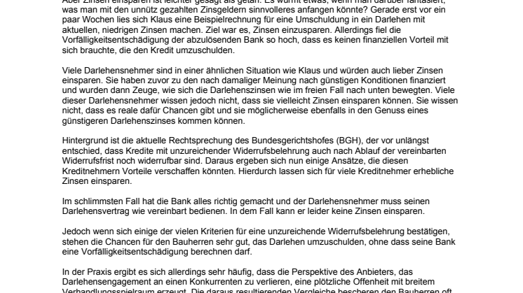 Hintergrund ist die aktuelle Rechtsprechung des Bundesgerichtshofes (BGH), der vor unlängst entschied, dass Kredite mit unzureichender Widerrufsbelehrung auch nach Ablauf der vereinbarten Widerrufsfrist noch widerrufbar sind. Daraus ergeben sich nun einige Ansätze, die diesen Kreditnehmern Vorteile verschaffen könnten. Hierdurch lassen sich für viele Kreditnehmer erhebliche Zinsen einsparen.