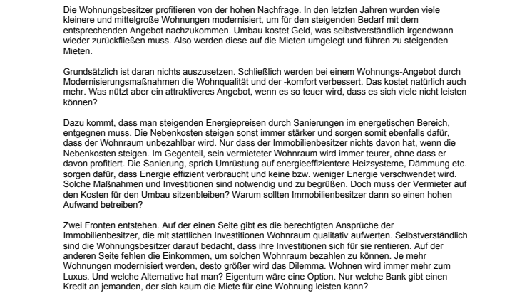 Zwei Fronten entstehen. Auf der einen Seite gibt es die berechtigten Ansprüche der Immobilienbesitzer, die mit stattlichen Investitionen Wohnraum qualitativ aufwerten. Selbstverständlich sind die Wohnungsbesitzer darauf bedacht, dass ihre Investitionen sich für sie rentieren. Auf der anderen Seite fehlen die Einkommen, um solchen Wohnraum bezahlen zu können. Je mehr Wohnungen modernisiert werden, desto größer wird das Dilemma. Wohnen wird immer mehr zum Luxus. Und welche Alternative hat man? Eigentum wäre eine Option. Nur welche Bank gibt einen Kredit an jemanden, der sich kaum die Miete für eine Wohnung leisten kann?