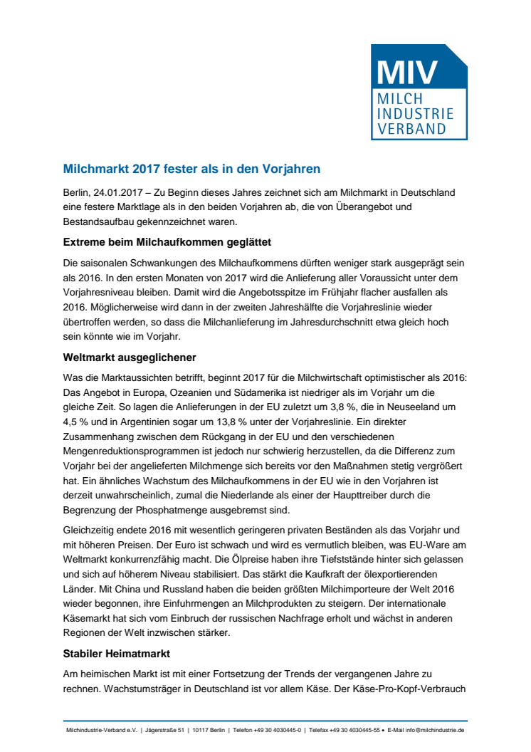 Zu Beginn dieses Jahres zeichnet sich am Milchmarkt in Deutschland eine festere Marktlage als in den beiden Vorjahren ab, die von Überangebot und Bestandsaufbau gekennzeichnet waren.