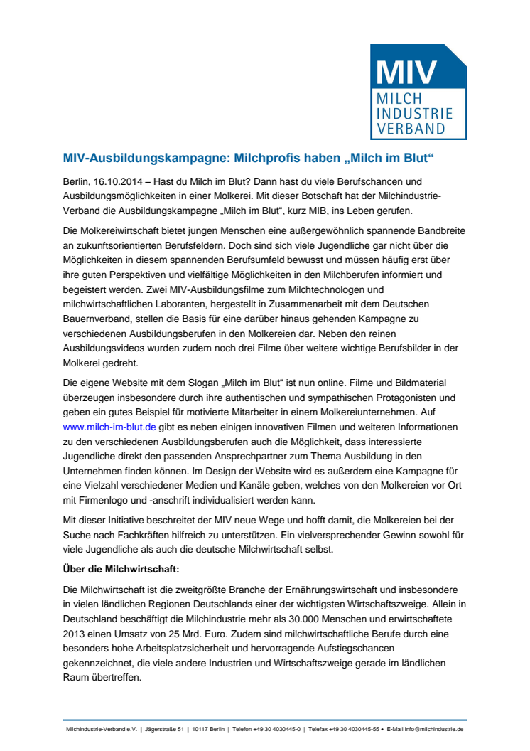 Hast du Milch im Blut? Dann hast du viele Berufschancen und Ausbildungsmöglichkeiten in einer Molkerei. Mit dieser Botschaft hat der Milchindustrie-Verband die Ausbildungskampagne „Milch im Blut“, kurz MIB, ins Leben gerufen.