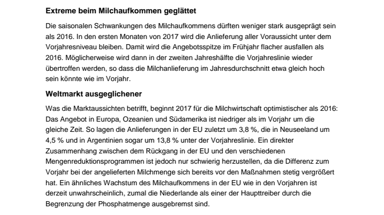 Bei dem derzeit niedrigeren Milchaufkommen in wichtigen Regionen der Welt und stabiler bis leicht wachsender Nachfrage dürfte sich die Marktlage 2017 ausgeglichener darstellen als in den beiden Vorjahren, die von Bestandsaufbau und schwachen Preisen gekennzeichnet waren. Die festeren Tendenzen bei den Milchauszahlungspreisen, die in den letzten Monaten von 2016 zu beobachten waren, halten derzeit weiter an. Nachdem in den beiden Vorjahren die 30-Cent-Marke im Durchschnitt nicht erreicht worden ist, kann für 2017 mit höheren Milchpreisen im Jahresdurchschnitt gerechnet werden.