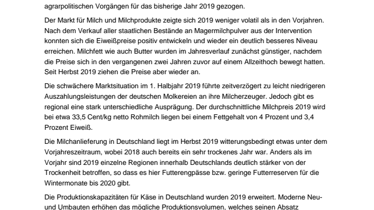 Der Markt für Milch und Milchprodukte zeigte sich 2019 weniger volatil als in den Vorjahren. Nach dem Verkauf aller staatlichen Bestände an Magermilchpulver aus der Intervention konnten sich die Eiweißpreise positiv entwickeln und wieder ein deutlich besseres Niveau erreichen. Milchfett wie auch Butter wurden im Jahresverlauf zunächst günstiger, nachdem die Preise sich in den vergangenen zwei Jahren zuvor auf einem Allzeithoch bewegt hatten. Seit Herbst 2019 ziehen die Preise aber wieder an.