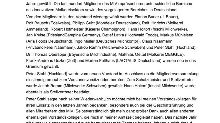 Peter Stahl (Hochland) wurde vom neuen Vorstand im Anschluss an die Mitgliederversammlung einstimmig erneut zum Vorstandsvorsitzenden berufen. Zum Schatzmeister und Stellvertreter wurde Jakob Ramm (Milchwerke Schwaben) gewählt. Hans Holtorf (frischli Milchwerke) wurde ebenfalls als Stellvertreter bestätigt.