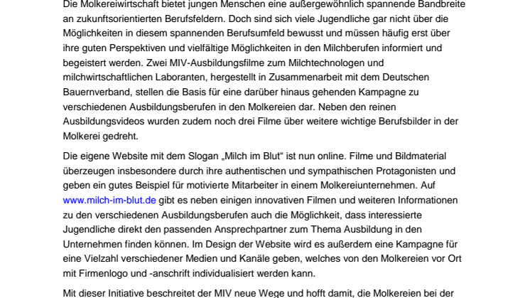 Die Molkereiwirtschaft bietet jungen Menschen eine außergewöhnlich spannende Bandbreite an zukunftsorientierten Berufsfeldern. Doch sind sich viele Jugendliche gar nicht über die Möglichkeiten in diesem spannenden Berufsumfeld bewusst und müssen häufig erst über ihre guten Perspektiven und vielfältige Möglichkeiten in den Milchberufen informiert und begeistert werden. Zwei MIV-Ausbildungsfilme zum Milchtechnologen und milchwirtschaftlichen Laboranten, hergestellt in Zusammenarbeit mit dem Deutschen Bauernverband, stellen die Basis für eine darüber hinaus gehenden Kampagne zu verschiedenen Ausbildungsberufen in den Molkereien dar. Neben den reinen Ausbildungsvideos wurden zudem noch drei Filme über weitere wichtige Berufsbilder in der Molkerei gedreht.