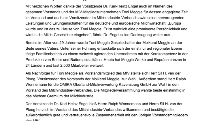 Als Nachfolger für Toni Meggle als Vorstandsmitglied des MIV stellte sich Herr Sil H. van der Ploeg, Vorsitzender des Vorstands der Molkerei Meggle, zur Wahl. Außerdem stand Herr Ralph Wonnemann für die OMIRA Oberland-Milchverwertung Ravensburg GmbH zur Wahl in den Vorstand des Milchindustrie-Verbandes. Die Mitgliederversammlung wählte beide einstimmig in das höchste Gremium der Milchindustrie.
