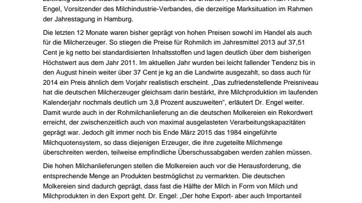 Die letzten 12 Monate waren bisher geprägt von hohen Preisen sowohl im Handel als auch für die Milcherzeuger. So stiegen die Preise für Rohmilch im Jahresmittel 2013 auf 37,51 Cent je kg netto bei standardisierten Inhaltsstoffen und lagen deutlich über dem bisherigen Höchstwert aus dem Jahr 2011. Im aktuellen Jahr wurden bei leicht fallender Tendenz bis in den August hinein weiter über 37 Cent je kg an die Landwirte ausgezahlt, so dass auch für 2014 ein Preis ähnlich dem Vorjahr realistisch erscheint. „Das zufriedenstellende Preisniveau hat die deutschen Milcherzeuger gleichsam darin bestärkt, ihre Milchproduktion im laufenden Kalenderjahr nochmals deutlich um 3,8 Prozent auszuweiten“, erläutert Dr. Engel weiter. Damit wurde auch in der Rohmilchanlieferung an die deutschen Molkereien ein Rekordwert erreicht, der zwischenzeitlich auch von maximal ausgelasteten Verarbeitungskapazitäten geprägt war. Jedoch gilt immer noch bis Ende März 2015 das 1984 eingeführte Milchquotensystem, so dass diejenigen Erzeuger, die ihre zugeteilte Milchmenge überschreiten werden, teilweise empfindliche Überschussabgaben werden zahlen müssen.