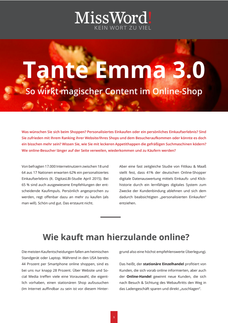 Online Shopping ist Trend. Komfortables Einkaufen im Internet hat sich längst verselbständigt - auch Frischkost, Luxuswaren, Raritäten gehen online über die Ladentheke. Personalisiertes Shoppen auf der Basis digitaler Daten aus Klickhistorien lehnen viele User ab. Gleichzeitig wünschen sie sich ein persönliches Einkaufserlebnis. Warum verzichten viele Webshops auf zielführendes Content Marketing?