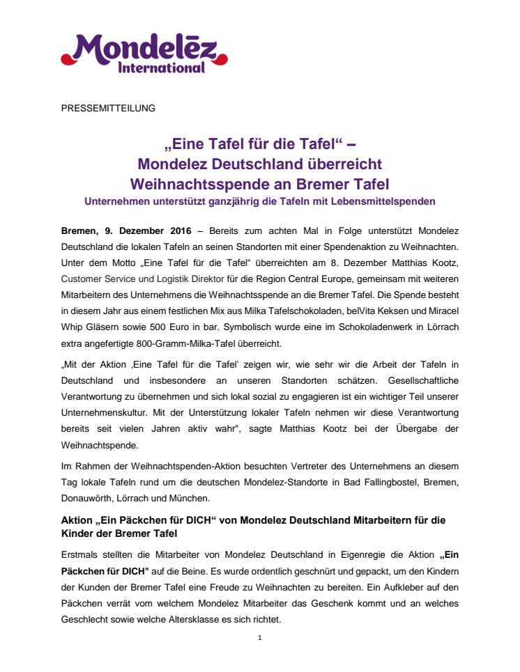 „Eine Tafel für die Tafel“ – Mondelez Deutschland überreicht Weihnachtsspende an Bremer Tafel
