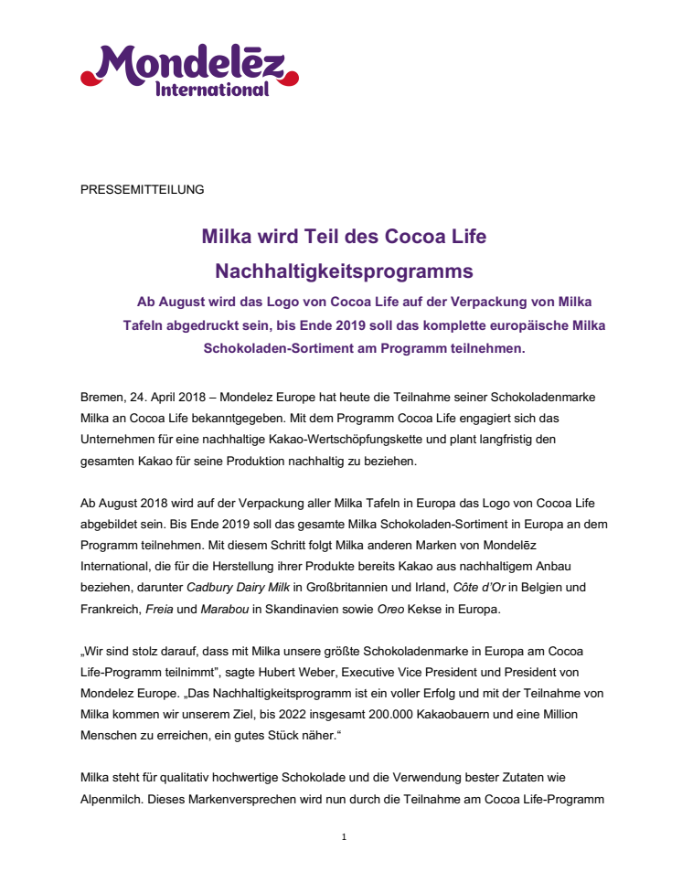 Ab August wird das Logo von Cocoa Life auf der Verpackung von Milka Tafeln abgedruckt sein, bis Ende 2019 soll das komplette europäische Milka Schokoladen-Sortiment am Programm teilnehmen.