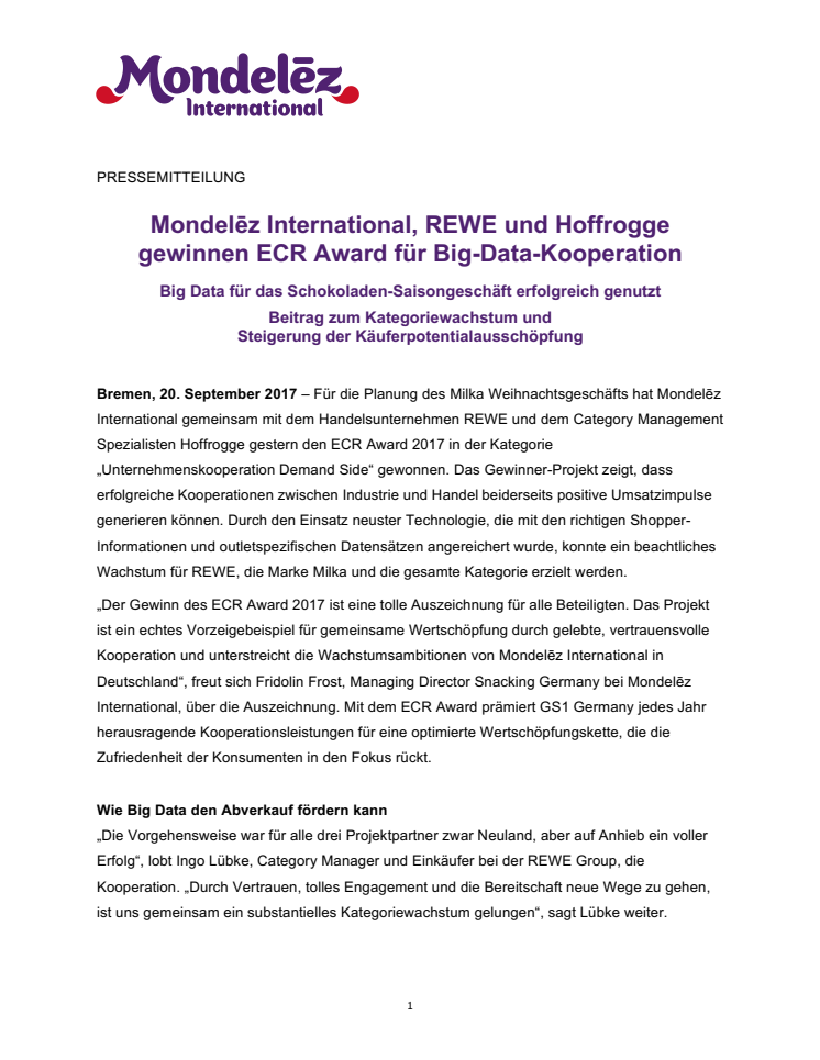 Für die Planung des Milka Weihnachtsgeschäfts hat Mondelēz International gemeinsam mit dem Handelsunternehmen REWE und dem Category Management Spezialisten Hoffrogge gestern den ECR Award 2017 in der Kategorie „Unternehmenskooperation Demand Side“ gewonnen.