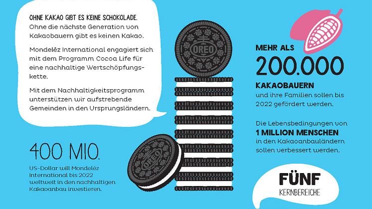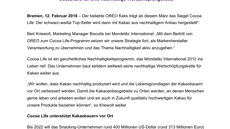 Bremen, 12. Februar 2018 – Der beliebte OREO Keks trägt ab diesem März das Siegel Cocoa Life: Der schwarz-weiße Top-Seller wird dann mit Kakao aus nachhaltigem Anbau hergestellt*.