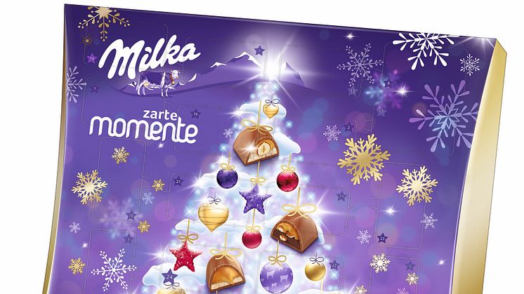 2020 knüpft Milka an diese erfolgreiche Tradition mit zwei Neuheiten an: mit dem Milka Zarte Momente Adventskalender (211 g) mit den beliebten fünf Pralinen-Variationen für Erwachsene. Das hochwertige Design mit den geschwungenen, goldfarbenen Seiten der Verpackung machen ihn besonders ansprechend.