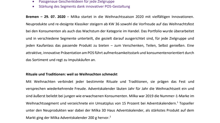 Bremen – 29. 07. 2020 – Milka startet in die Weihnachtssaison 2020 mit vielfältigen Innovationen. Neuprodukte und re-designte Klassiker steigern ab KW 36 sowohl die Vorfreude auf das Weihnachtsfest bei den Konsumenten als auch das Wachstum der Kategorie im Handel. Das Portfolio wurde überarbeitet und in verschiedene Segmente unterteilt, die gezielt darauf ausgerichtet sind, für jede Zielgruppe und jeden Kaufanlass das passende Produkt zu bieten – zum Verschenken, Teilen, Selbst genießen. Eine attraktive, innovative Präsentation am POS führt aufmerksamkeitsstark und konsumentenorientiert durch das Sortiment und regt zu Impulskäufen an.