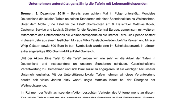 Bremen, 9. Dezember 2016 – Bereits zum achten Mal in Folge unterstützt Mondelez Deutschland die lokalen Tafeln an seinen Standorten mit einer Spendenaktion zu Weihnachten. Unter dem Motto „Eine Tafel für die Tafel“ überreichten am 8. Dezember Matthias Kootz, Customer Service und Logistik Direktor für die Region Central Europe, gemeinsam mit weiteren Mitarbeitern des Unternehmens die Weihnachtsspende an die Bremer Tafel. Die Spende besteht in diesem Jahr aus einem festlichen Mix aus Milka Tafelschokoladen, belVita Keksen und Miracel Whip Gläsern sowie 500 Euro in bar. Symbolisch wurde eine im Schokoladenwerk in Lörrach extra angefertigte 800-Gramm-Milka-Tafel überreicht.