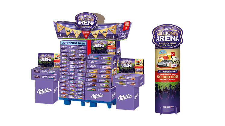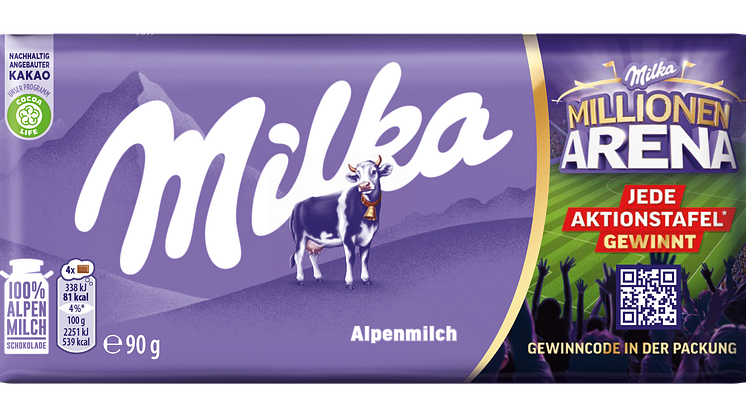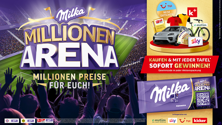 Der Beginn der neuen Saison 2025/2026 markiert den Höhepunkt in diesem Jahr: Im dritten Quartal 2025 startet Milka die „Millionen-Arena“ mit mehr als 50 Millionen Sofortgewinnen – denn jede Aktionstafel ist ein Gewinn. Es warten attraktive Preise: Geldgewinne im Wert von einer Million Euro, Autos, E-Bikes, Reise-Gutscheine, Tickets für Spiele der Bundesliga / 2. Bundesliga und vieles mehr. Ein besonderes Highlight: Ein exklusives Erlebnis als Sky-Ballträgerkind. Partner wie Borussia Dortmund und FC Bayern München, Sky, Kicker, TUI und e-motion ermöglichen eine Vielzahl an weiteren attraktiven Gewinnen. Auch hier ist die Teilnahme einfach: Milka Aktionstafel kaufen, den individuellen Gewinncode, der sich auf der Verpackungsinnenseite befindet, auf der Website www.fcmilka.de eingeben und sofort erfahren, was man gewonnen hat. Auch hier kann nach dem Kauf weiterer Aktionstafeln mehrfach teilgenommen werden. Die Aktivierung läuft von KW 31 bis KW 43.