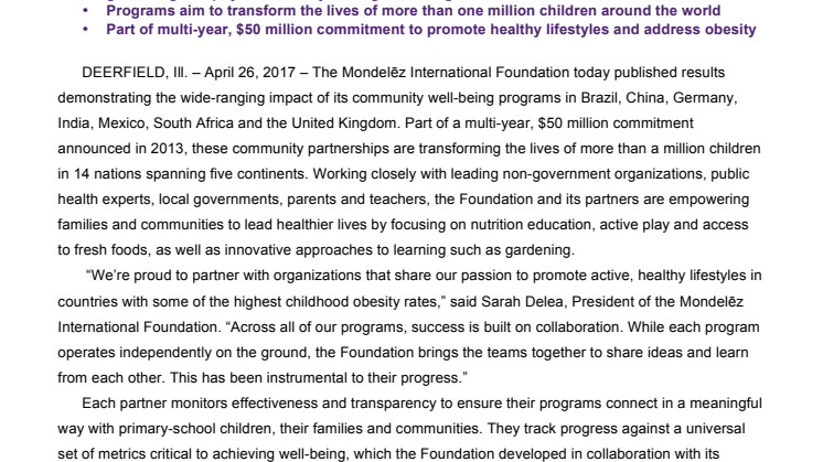 DEERFIELD, Ill. – April 26, 2017 – The Mondelēz International Foundation today published results demonstrating the wide-ranging impact of its community well-being programs in Brazil, China, Germany, India, Mexico, South Africa and the United Kingdom. Part of a multi-year, $50 million commitment announced in 2013, these community partnerships are transforming the lives of more than a million children in 14 nations spanning five continents. Working closely with leading non-government organizations, public health experts, local governments, parents and teachers, the Foundation and its partners are empowering families and communities to lead healthier lives by focusing on nutrition education, active play and access to fresh foods, as well as innovative approaches to learning such as gardening.