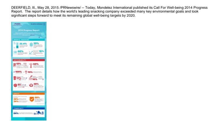 DEERFIELD, Ill., May 28, 2015 /PRNewswire/ -- Today, Mondelez International published its Call For Well-being 2014 Progress Report. The report details how the world's leading snacking company exceeded many key environmental goals and took significant steps forward to meet its remaining global well-being targets by 2020.