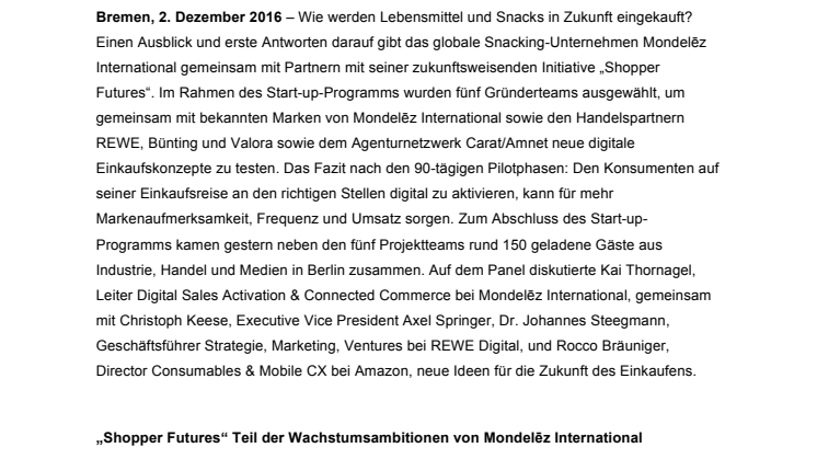 Bremen, 2. Dezember 2016 – Wie werden Lebensmittel und Snacks in Zukunft eingekauft? Einen Ausblick und erste Antworten darauf gibt das globale Snacking-Unternehmen Mondelēz International gemeinsam mit Partnern mit seiner zukunftsweisenden Initiative „Shopper Futures“. Im Rahmen des Start-up-Programms wurden fünf Gründerteams ausgewählt, um gemeinsam mit bekannten Marken von Mondelēz International sowie den Handelspartnern REWE, Bünting und Valora sowie dem Agenturnetzwerk Carat/Amnet neue digitale Einkaufskonzepte zu testen. Das Fazit nach den 90-tägigen Pilotphasen: Den Konsumenten auf seiner Einkaufsreise an den richtigen Stellen digital zu aktivieren, kann für mehr Markenaufmerksamkeit, Frequenz und Umsatz sorgen. Zum Abschluss des Start-up-Programms kamen gestern neben den fünf Projektteams rund 150 geladene Gäste aus Industrie, Handel und Medien in Berlin zusammen. Auf dem Panel diskutierte Kai Thornagel, Leiter Digital Sales Activation & Connected Commerce bei Mondelēz International, gemeinsam mit Christoph Keese, Executive Vice President Axel Springer, Dr. Johannes Steegmann, Geschäftsführer Strategie, Marketing, Ventures bei REWE Digital, und Rocco Bräuniger, Director Consumables & Mobile CX bei Amazon, neue Ideen für die Zukunft des Einkaufens.
