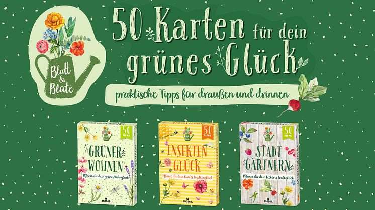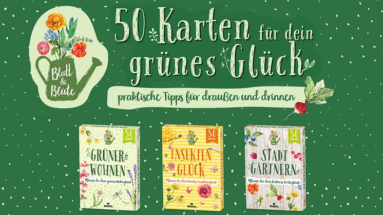 Alle Blatt & Blüte Kartensets: Autorin: Bärbel Oftring; Design: Christina Kölsch 50 Karten in einer Schachtel; € 9,95 (D), € 10,30 (A) Stadtgärtnern: ISBN 978-3-96455-184-9 Insektenglück: ISBN 978-3-96455-185-6 Grüner Wohnen: ISBN 978-3-96455-186-3 |