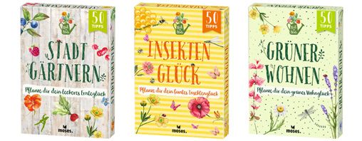 Die handlichen Karten sind erhältlich in drei Editionen. Während sich beim „Stadtgärtnern“ alles um selbst angebautes Obst und Gemüse, die eigene Kräuterküche und das Anpflanzen und Ernten im heimischen Nutzgarten dreht, hilft das Set „Insektenglück“ dabei, den heimischen Balkon oder Garten mit Insektenhotels, Nisthilfen und insektenfreundlichen Blumen zu einem bunten Paradies für kleine Krabbler zu machen. Die Karten zum Thema „Grüner Wohnen“ hingegen liefern wissenswerte Tipps und Tricks rund um Zimmerpflanzen, Balkonbepflanzung und Deko-Ideen für den Garten. Ein Muss für Hobbygärtner*innen und alle, die es werden wollen!