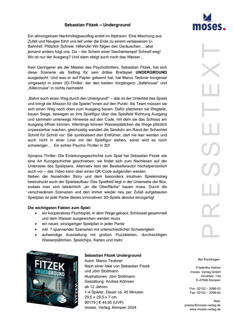 kein Geringerer als der Meister des Psychothrillers, Sebastian Fitzek, hat sich diese Szenerie als Setting für das Brettspiel UNDERGROUND ausgedacht. Und was er auf Papier gebannt hat, hat Spiele-Autor Marco Teubner kongenial umgesetzt in einen 3D-Thriller, der den beiden Vorgängern „Safehouse“ und „Killercruise“ in nichts nachsteht.