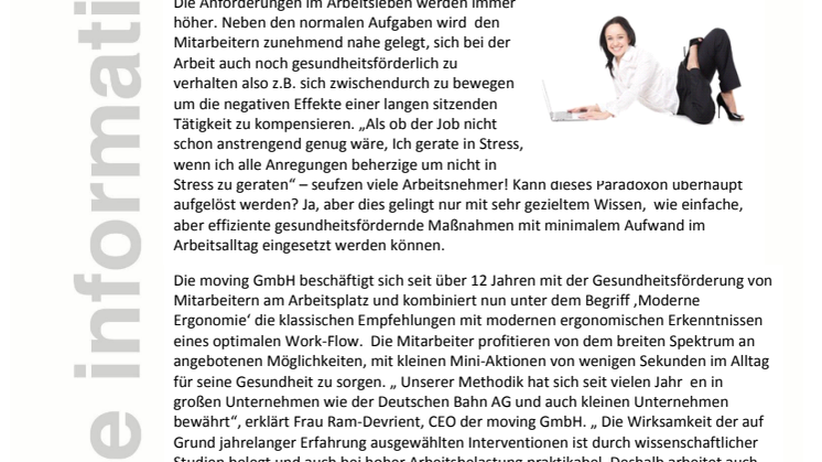 Die moving GmbH beschäftigt sich seit über 12 Jahren mit der Gesundheitsförderung von Mitarbeitern am Arbeitsplatz und kombiniert nun unter dem Begriff ‚Moderne Ergonomie‘ die klassischen Empfehlungen mit modernen ergonomischen Erkenntnissen eines optimalen Work-Flow. Die Mitarbeiter profitieren von dem breiten Spektrum an angebotenen Möglichkeiten, mit kleinen Mini-Aktionen von wenigen Sekunden im Alltag für seine Gesundheit zu sorgen. „ Unserer Methodik hat sich seit vielen Jahr en in großen Unternehmen wie der Deutschen Bahn AG und auch kleinen Unternehmen bewährt“, erklärt Frau Ram-Devrient, CEO der moving GmbH. „ Die Wirksamkeit der auf Grund jahrelanger Erfahrung ausgewählten Interventionen ist durch wissenschaftlicher Studien belegt und auch bei hoher Arbeitsbelastung praktikabel. Deshalb arbeitet auch die Barmer GEK seit Jahren bundesweit mit unserem Konzept.“