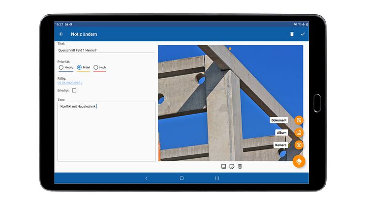 Anwender können Bilder oder Grafiken direkt mit der Kamera aufnehmen oder aus einem vorhandenen Album zum Statik-Dokument in der App hinzufügen. Auch Auszüge aus dem Dokument selbst können eingefügt werden. Mit der Editierfunktion sind zudem Markierungen möglich.