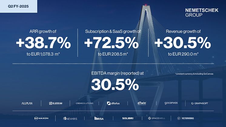 München, 31. Juli 2025 – Die Nemetschek Group, ein global agierender Anbieter von Softwarelösungen für die Bau- und Medienbranche, verzeichnete im zweiten Quartal 2025 erneut ein sehr starkes und profitables Wachstum. Die dynamische Entwicklung ist einerseits auf das Design-Segment zurückzuführen, das neben einer guten operativen Performance erneut von einer stärker als erwarteten Nachfrage nach Mehrjahresverträgen profitierte. Diese werden strategisch eingesetzt, um die Umstellung des Segments auf ein Subskriptionsmodell zu beschleunigen. Zudem trug auch das Build-Segment mit einem weiterhin sehr starken organischen und anorganischen Wachstum (GoCanvas) zu der besser als erwarteten Entwicklung bei.