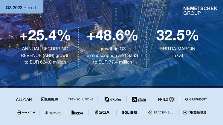 „Unser starkes drittes Quartal zeigt, dass die Nemetschek Group weiterhin klar auf Wachstumskurs ist – bei gleichzeitiger Umstellung auf ein Subskriptions- und SaaS-Modell und trotz der herausfordernden wirtschaftlichen Rahmenbedingungen“, so Yves Padrines, CEO der Nemetschek Group. „Wir setzen unsere Strategie weiter konsequent um, bei der wir wertsteigerndes Wachstum generieren und die digitale Transformation und den Wandel zu mehr Nachhaltigkeit unserer Kunden beschleunigen. Mit unserem neuen und schlagkräftigen Führungsteam schaue ich sehr positiv in die Zukunft. Wir werden die großen Potenziale in unseren Märkten weiter nutzen und unsere strategischen Themen wie die weitere Subskriptions- und SaaS-Umstellung, die Internationalisierung, die Steigerung der internen Effizienz sowie neue Technologien konsequent voranzutreiben. Erst kürzlich haben wir unsere neue horizontale, offene und datengetriebene Cloud-Digital-Twin-Plattform dTwin am Markt vorgestellt. Weitere Innovationen und Features im Bereich künstliche Intelligenz und Nachhaltigkeit werden folgen.“