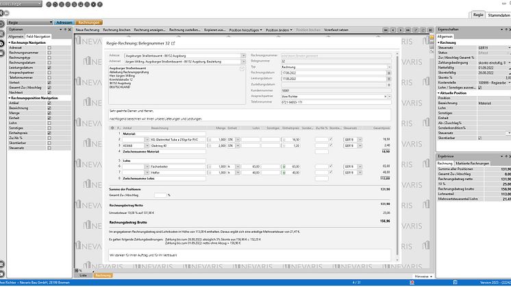 NEVARIS Regie gibt den Anwender:innen der leistungsstarken Bausoftware die Möglichkeit, Lieferungen und Leistungen, die keinen direkten Bezug zu NEVARIS Build haben müssen, abzurechnen. Außerdem lassen sich nun sehr einfach sowie effizient kleine Bauaufträge in Rechnung stellen, die zum Beispiel auf der Basis von Einzelnachweisen privater Auftraggeber:innen erfolgt. Mit NEVARIS Regie ebenso möglich ist die Rechnungserstellung für Weiterverkäufe – so aus dem Inventar des Unternehmens (Gebrauchtwagenverkauf, Maschinenverkauf) oder dem eigenen Lager (Materialverkauf aus firmeneigenem Bestand).