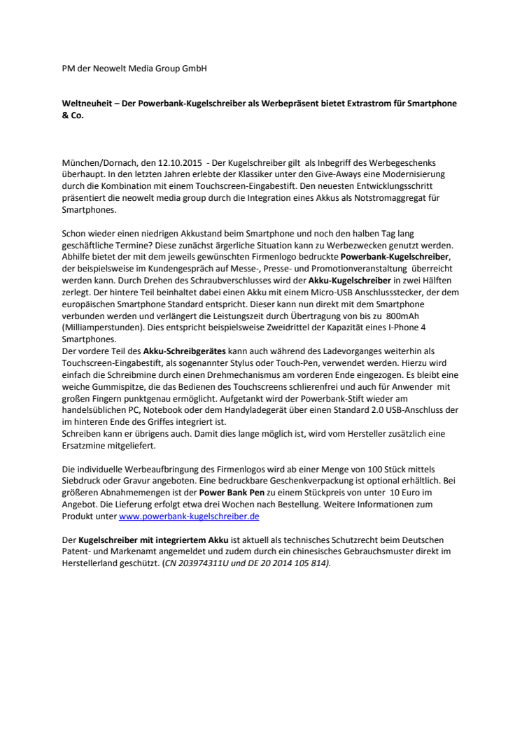 München/Dornach, den 13.10.2015 - Die neowelt media group GmbH präsentiert einen Werbekugelschreiber mit integriertem Akku als Notstromversorgung für Smartphones und Tablets.