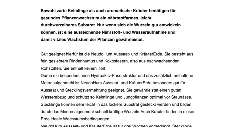 Durch die besonders feine Hydroaktiv-Faserstruktur und das zusätzlich enthaltene Meeresalgenmehl ist NeudoHum Aussaat- und KräuterErde besonders gut für Aussaat und Stecklingsvermehrung geeignet. Sie gewährleistet einen guten Wasserabzug und schützt so Keimlinge und Jungpflanzen optimal vor Staunässe. Stecklinge können sehr leicht in das lockere Substrat gesteckt werden und bilden durch das Meeresalgenmehl schnell kräftige Wurzeln.Auch Kräuter finden in dieser Erde ideale Wachstumsbedingungen.
