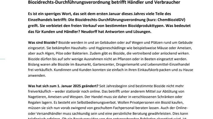 Es ist ein sperriges Wort, das seit dem ersten Januar dieses Jahres viele Teile des Einzelhandels betrifft: Die Biozidrechts-Durchführungsverordnung (kurz: ChemBiozidDV) greift. Sie verbietet den freien Verkauf von bestimmten Biozidprodukttypen. Was bedeutet das für Kunden und Händler? Neudorff hat Antworten und Lösungen.