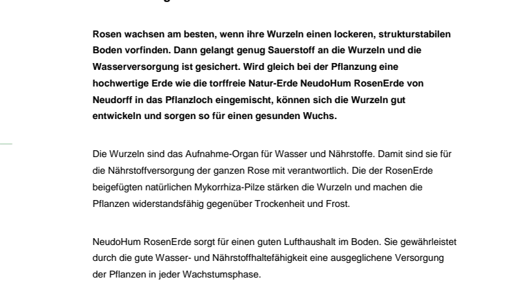 NeudoHum RosenErde sorgt für einen guten Lufthaushalt im Boden. Sie gewährleistet durch die gute Wasser- und Nährstoffhaltefähigkeit eine ausgeglichene Versorgung der Pflanzen in jeder Wachstumsphase.