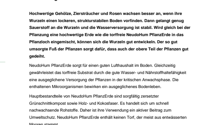 NeudoHum PflanzErde sorgt für einen guten Lufthaushalt im Boden. Gleichzeitig gewährleistet das torffreie Substrat durch die gute Wasser- und Nährstoffhaltefähigkeit eine ausgeglichene Versorgung der Pflanzen in der kritischen Anwachsphase. Die enthaltenen Mikroorganismen bewirken ein ausgeglichenes Bodenleben.