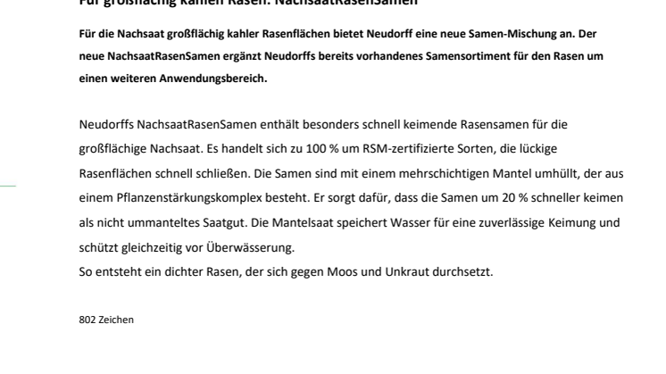 Für die Nachsaat großflächig kahler Rasenflächen bietet Neudorff eine neue Samen-Mischung an. Der neue NachsaatRasenSamen ergänzt Neudorffs bereits vorhandenes Samensortiment für den Rasen um einen weiteren Anwendungsbereich.