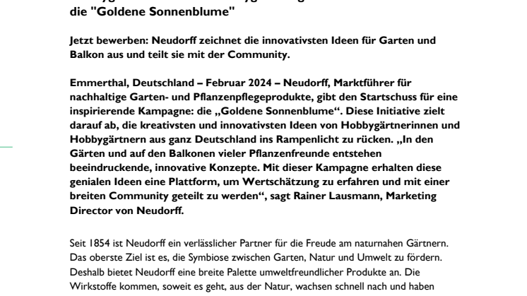 Seit 1854 ist Neudorff ein verlässlicher Partner für die Freude am naturnahen Gärtnern. Das oberste Ziel ist es, die Symbiose zwischen Garten, Natur und Umwelt zu fördern. Deshalb bietet Neudorff eine breite Palette umweltfreundlicher Produkte an. Die Wirkstoffe kommen, soweit es geht, aus der Natur, wachsen schnell nach und haben möglichst geringe Auswirkungen auf die Umwelt. Doch die Produkte von Neudorff sind nicht nur nachhaltig, sondern auch effektiv. Erfolgsfaktoren von Pflanzenschutzmitteln hängen von der richtigen Auswahl, Dosierung und Anwendung ab, um Effektivität und Umweltschutz zu gewährleisten, wobei Neudorff in diesem Bereich unterstützt. Nun möchte Neudorff die Freude am naturnahen Gärtnern teilen und die Community der Gärtnernden herausfordern – mit dem Award: Die „Goldene Sonnenblume“.