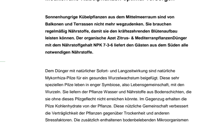 Sonnenhungrige Kübelpflanzen aus dem Mittelmeerraum sind von Balkonen und Terrassen nicht mehr wegzudenken. Sie brauchen regelmäßig Nährstoffe, damit sie den kräftezehrenden Blütenaufbau leisten können. Der organische Azet Zitrus- & MediterranpflanzenDünger mit dem Nährstoffgehalt NPK 7-3-6 liefert den Gästen aus dem Süden alle notwendigen Nährstoffe.