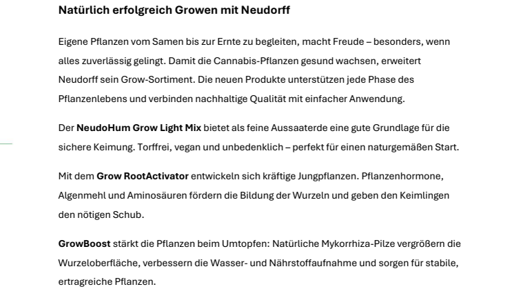 Eigene Pflanzen vom Samen bis zur Ernte zu begleiten, macht Freude – besonders, wenn alles zuverlässig gelingt. Damit die Cannabis-Pflanzen gesund wachsen, erweitert Neudorff sein Grow-Sortiment. Die neuen Produkte unterstützen jede Phase des Pflanzenlebens und verbinden nachhaltige Qualität mit einfacher Anwendung.