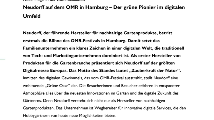 Inmitten des digitalen Gewimmels, das vom OMR-Festival ausstrahlt, stellt W. Neudorff GmbH KG eine wohltuende „Grüne Oase“ dar. Die Besucherinnen und Besucher erfahren in entspannter Atmosphäre alles über die neuesten Innovationen im Garten und die digitale Zukunft des Gärtnerns. Denn Neudorff versteht sich nicht nur als Hersteller von nachhaltigen Gartenprodukten. Das Unternehmen ist Wegbereiter für innovative digitale Services, die den Hobbygärtnern von heute neue Möglichkeiten bieten.