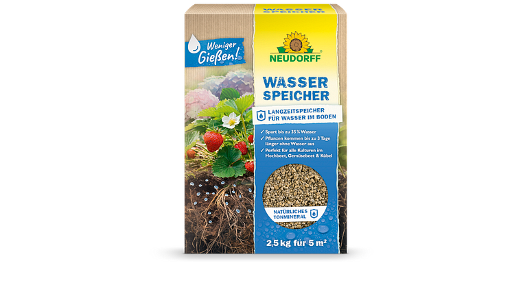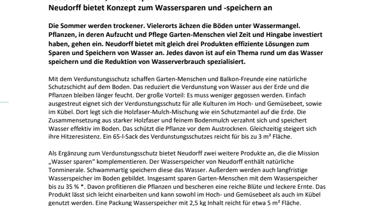 Die Sommer werden trockener. Vielerorts ächzen die Böden unter Wassermangel. Pflanzen, in deren Aufzucht und Pflege Garten-Menschen viel Zeit und Hingabe investiert haben, gehen ein. Neudorff bietet mit gleich drei Produkten effiziente Lösungen zum Sparen und Speichern von Wasser an. Jedes davon ist auf ein Thema rund um das Wasser speichern und die Reduktion von Wasserverbrauch spezialisiert.