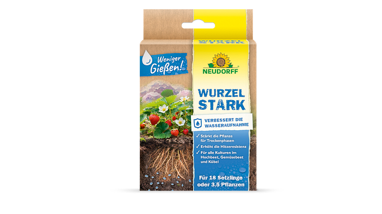 Wer sicher gehen will, seine Pflanzen bestmöglich vor Trockenstress zu schützen, nutzt außerdem die Vorteile der Mykorrhiza in Neudorffs Wurzelstark. Der Pilz bildet mit der Pflanze eine für beide Seiten gewinnbringende Lebensgemeinschaft. Die feinen Pilzfäden heften sich an die Pflanzenwurzeln und vergrößern dadurch die Wurzeloberfläche. So kann seltener gegossen werden. Im Gegenzug versorgt die Pflanze die Mykorrhiza mit Nährstoffen. Gleichzeitig sichert die bessere Wasserversorgung den Ertrag von knackigem Gemüse, süßem Obst und strahlenden Blumen. Eine Packung Wurzelstark enthält 36 g für 18 Stecklinge oder bis zu vier Pflanzen.