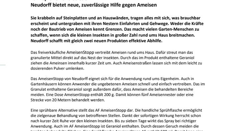 Sie krabbeln auf Steinplatten und an Hauswänden, tragen alles mit sich, was brauchbar erscheint und untergraben mit ihren Nestern Einfahrten und Gehwege. Weder die Kräfte noch der Bautrieb von Ameisen kennt Grenzen. Das macht vielen Garten-Menschen zu schaffen, wenn sich die kleinen Insekten in großer Zahl rund ums Haus breitmachen. Neudorff schafft mit gleich zwei neuen Produkten effektive Abhilfe.